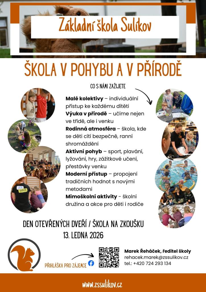 srdečně vás zveme na akci Škola na zkoušku, která proběhne v úterý 13. ledna 2026 v ZŠ Sulíkov. Akce je určena nejen budoucím prvňáčkům, ale také dětem, které zvažují přestup do vyššího ročníku a chtěly by si naši školu vyzkoušet.